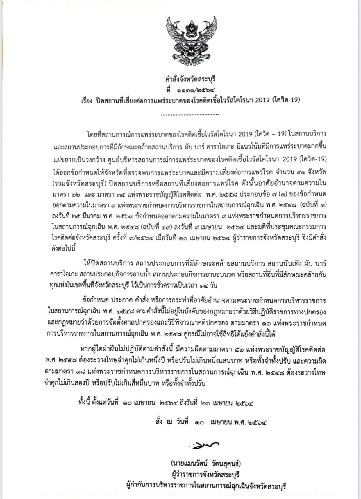 คำสั่งจังหวัดสระบุรี เรื่อง ปิดสถานที่เสี่ยงต่อการแพร่ระบาดของโรคโควิด-19